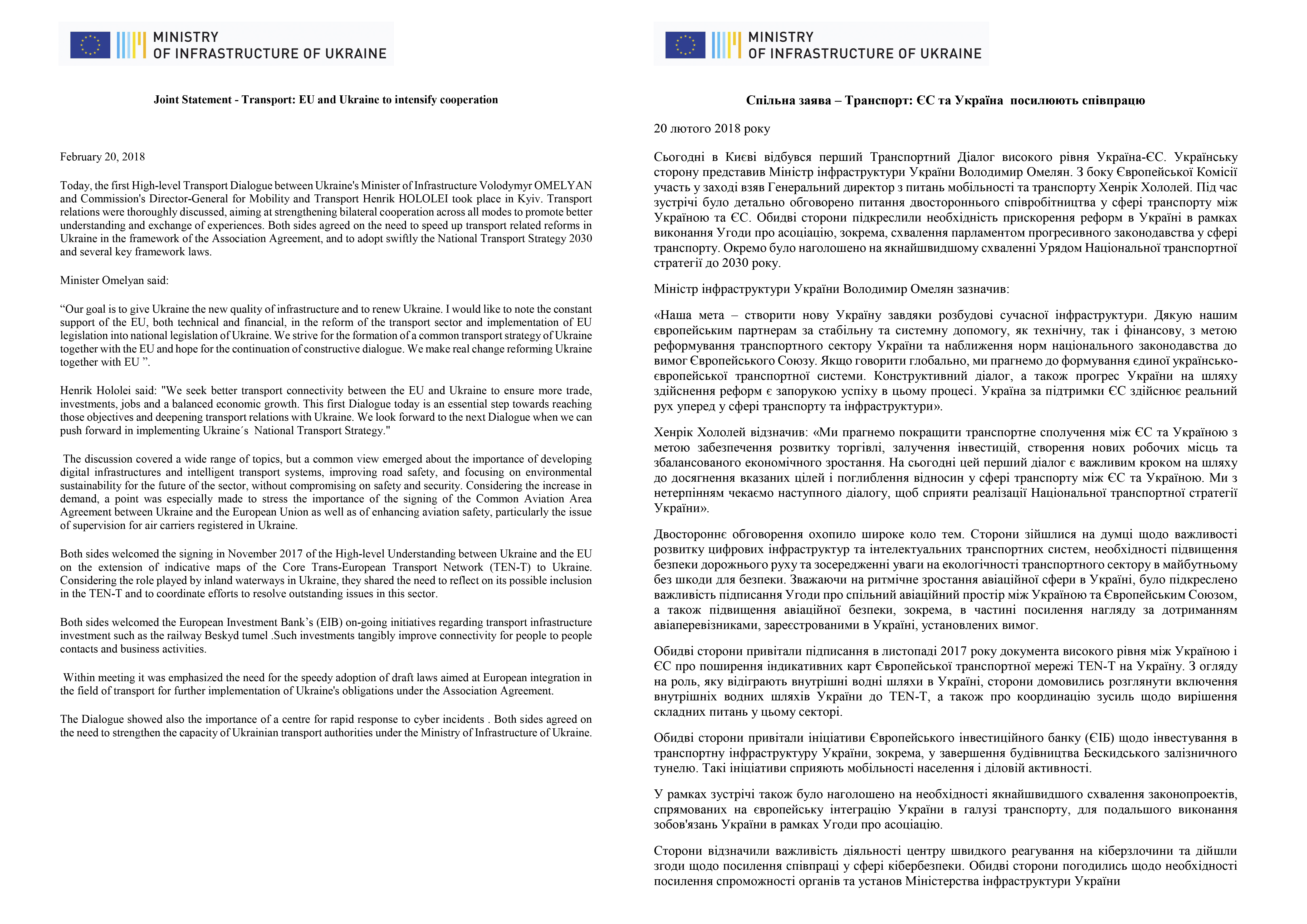 Спільна заява – Транспорт: активізація співробітництва між Україною та Європейським Союзом