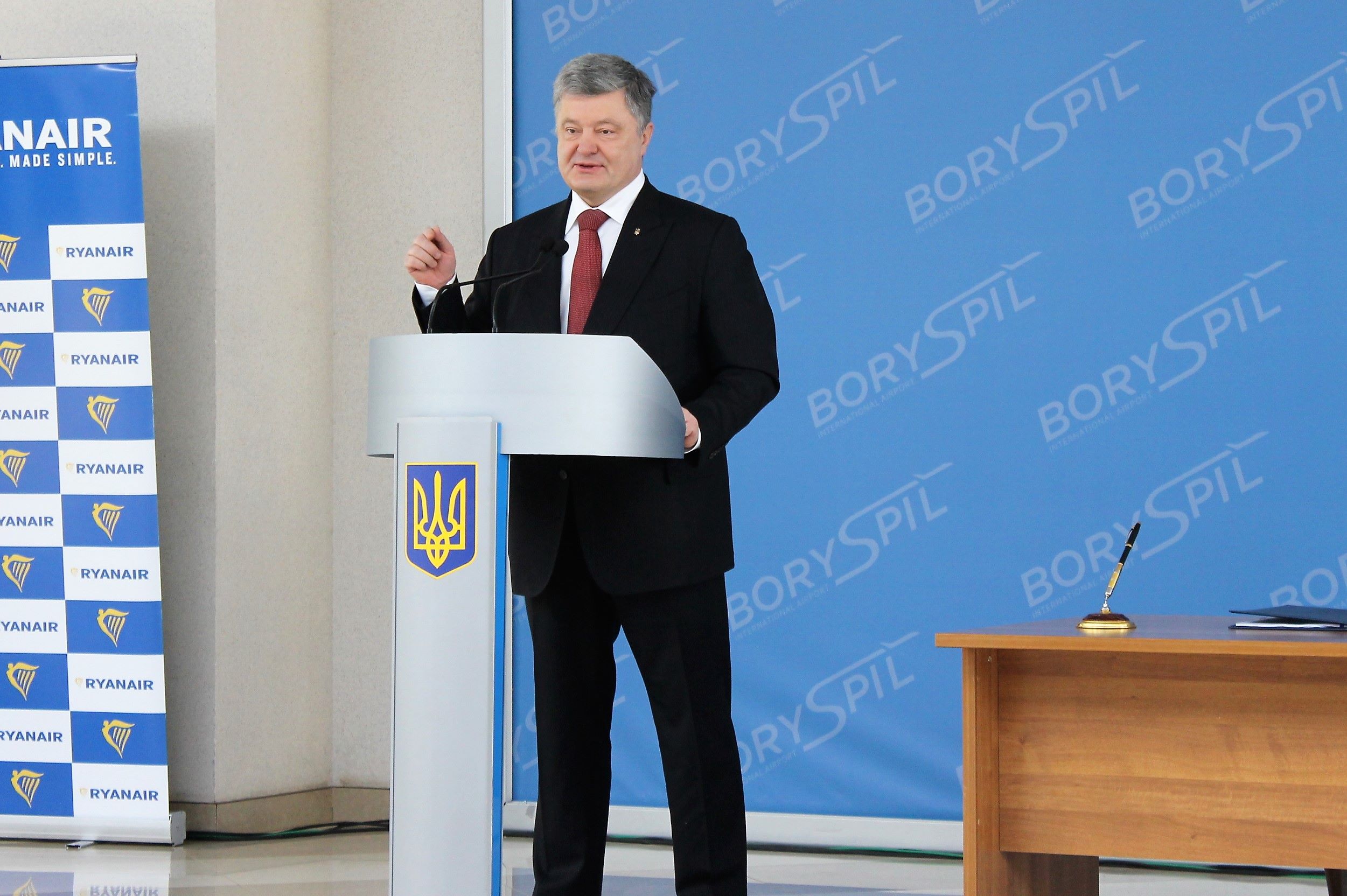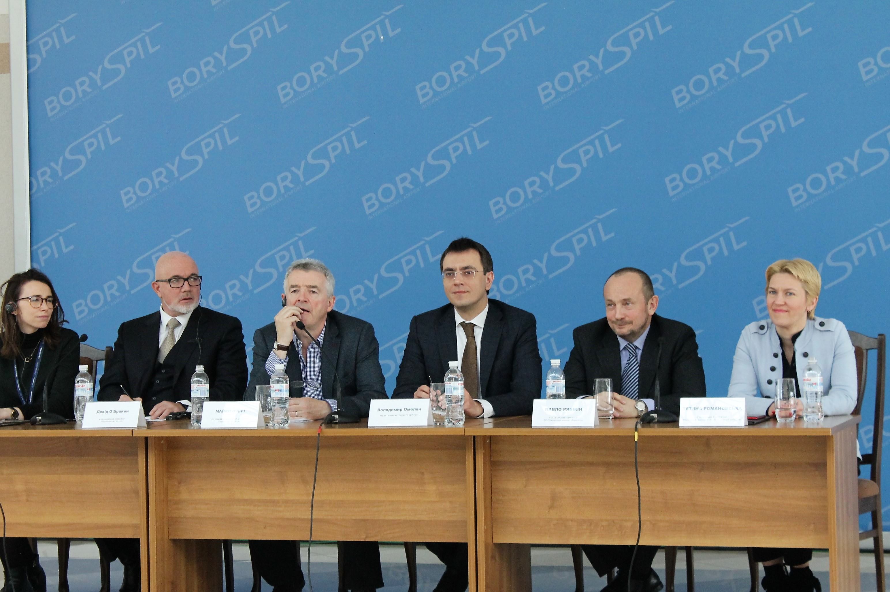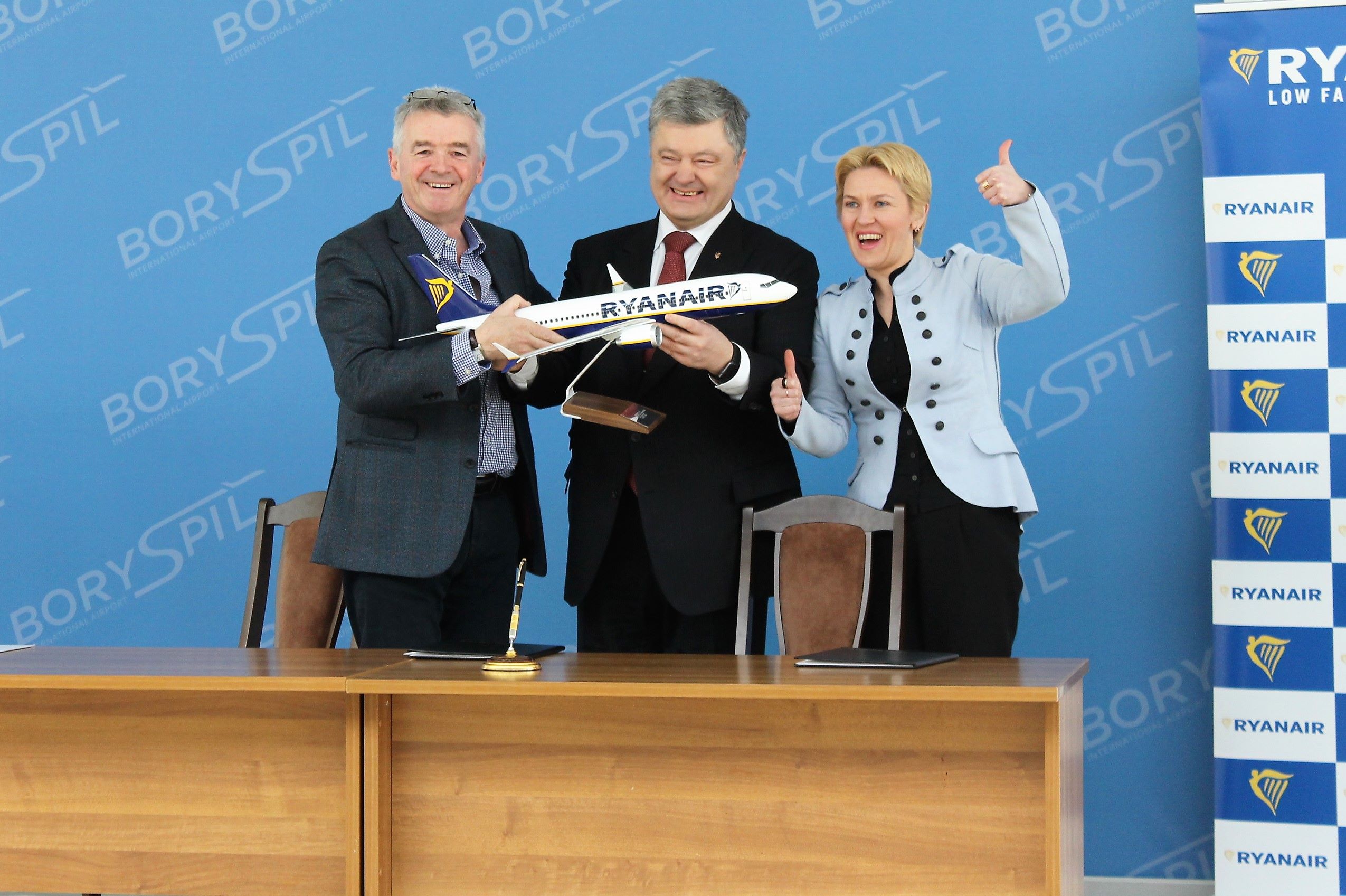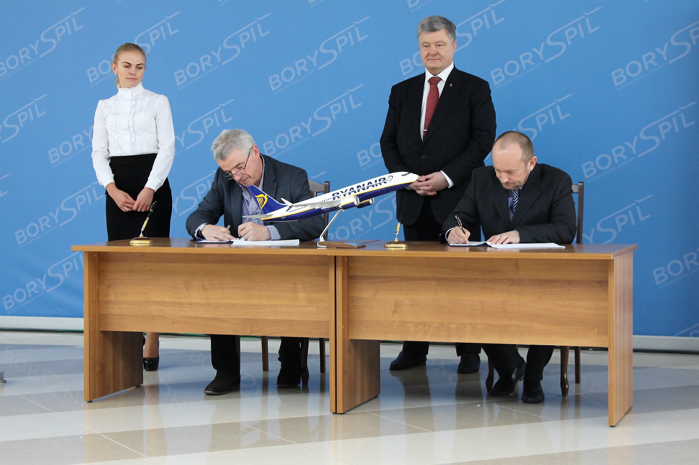23 березня 2018 року в присутності Президента України Петра Порошенка керівник аеропорту «Бориспіль» Павло Рябікін та очільниця летовища «Львів» Тетяна Романовська підписали контакт з найбільшою світовою авіакомпанією «Ryanair». З боку “Ryanair” контракт підписав генеральний директор авіакомпанії Майкл О‘Лірі.