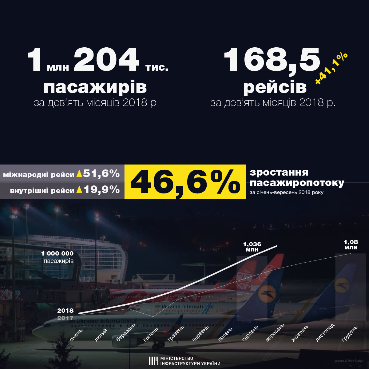 Загалом, за дев’ять місяців 2018 р. пасажиропотік зріс на 46,6% в порівнянні з показником аналогічного періоду минулого року (821,9 тис. пасажирів) і досяг позначки в 1204,7 тис. пасажирів. Кількість рейсів зросла на 28,6%, з 8 987 до 11 558.