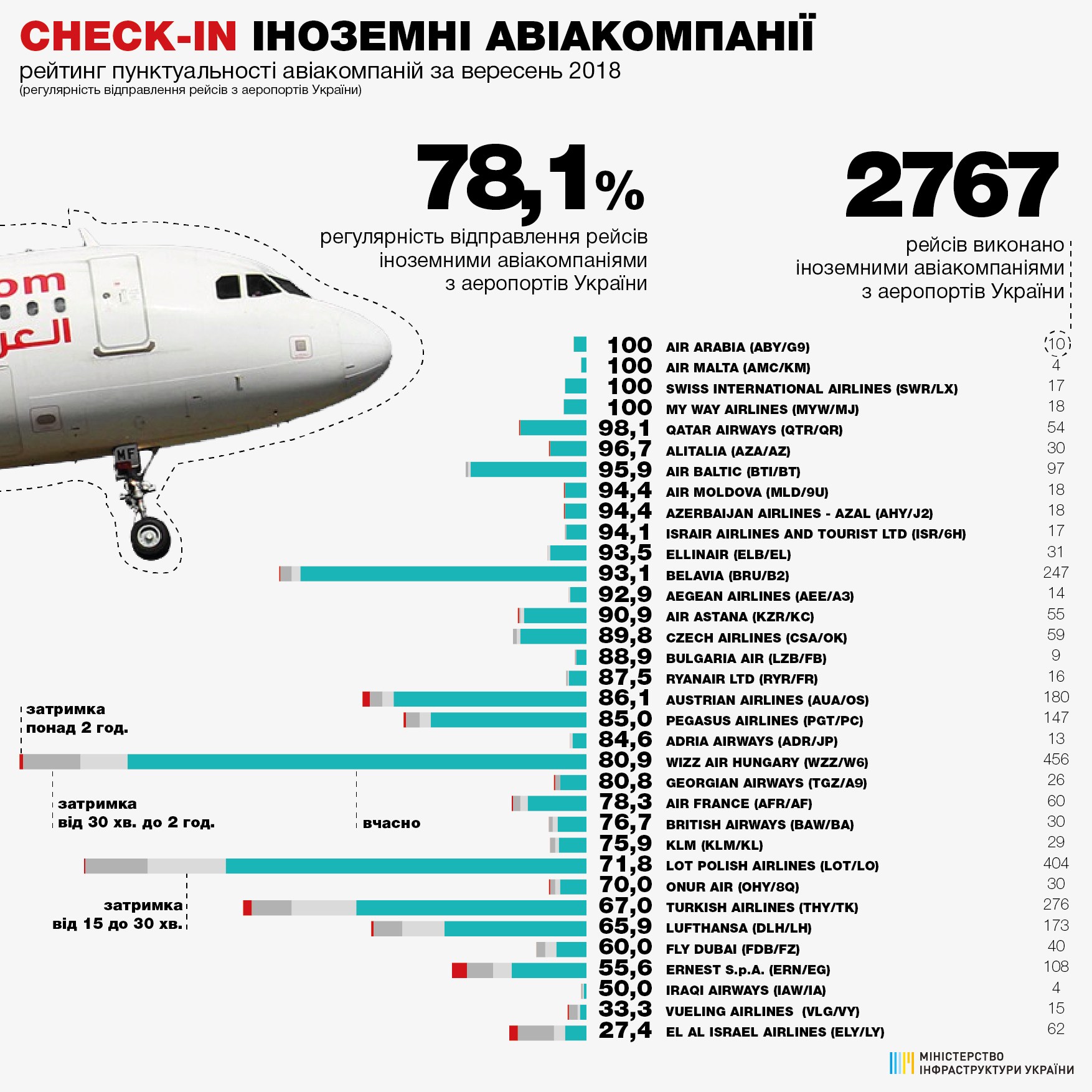 77,7% рейсів українських авіакомпаній з аеропортів України виконано вчасно