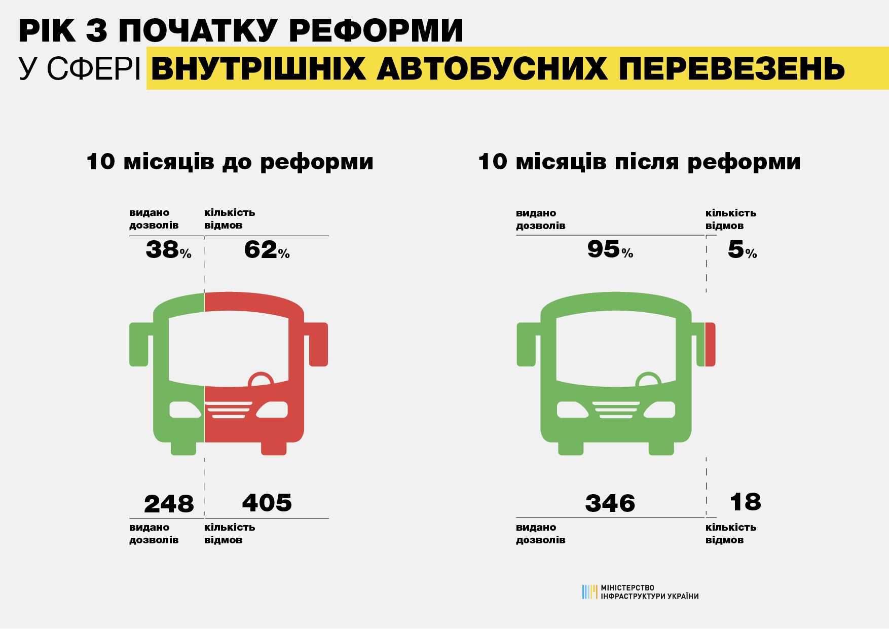 Відмінною рисою змін саме на міжобласних маршрутах стало ще й те, що за результатами проведених конкурсів переможцями стали по декілька (інколи до 7) перевізників одночасно, що створило здорову конкуренцію на даних маршрутах та надало змогу споживачам таких послуг самостійно обирати сервіс, перевізника, транспортні засоби, якими здійснювати поїздку.