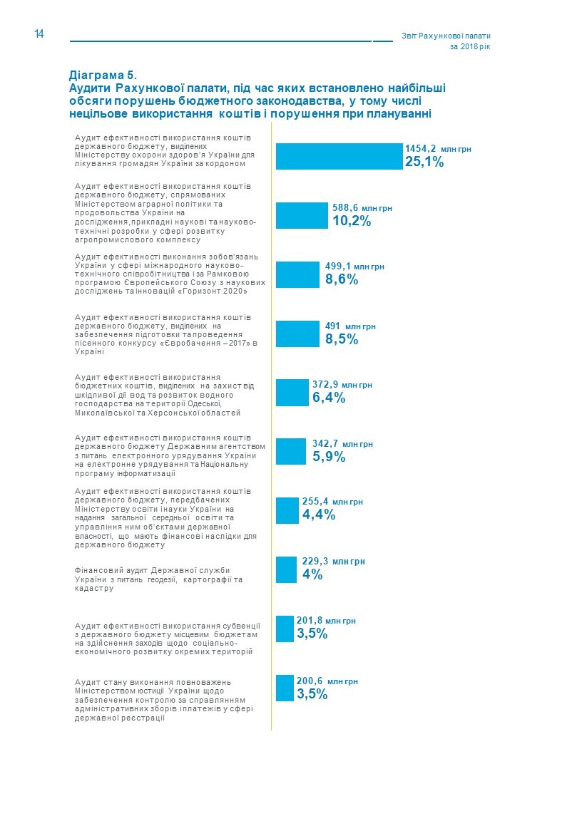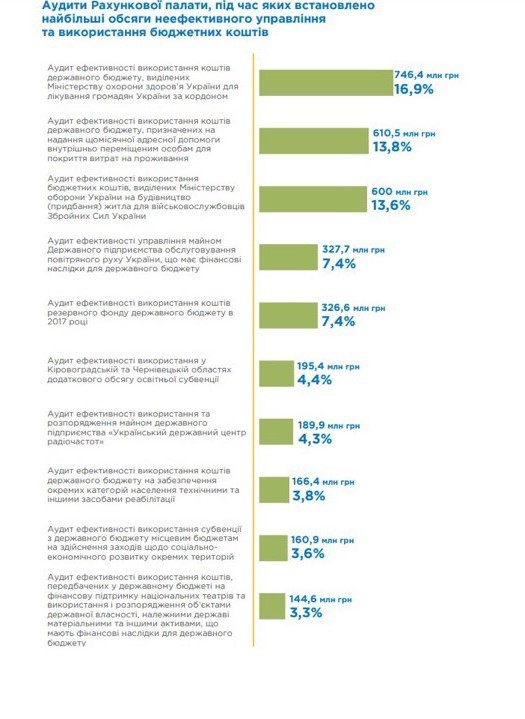 Про цьому у Звіті Рахункової палати за 2018 рік, оприлюдненому на сайті Рахункової Палати, Міністерство інфраструктури не згадується як найбільший неефективний розпорядник бюджетних коштів. Що видно з діаграм звіту, наведених нижче.