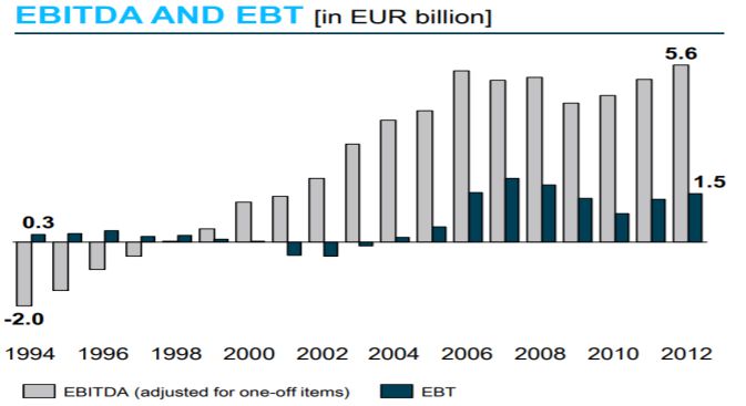 Незважаючи на отримання протягом останніх п′ятнадцяти років близько 55 млрд. німецьких марок державного фінансування у вигляді субсидій загальний борг німецької залізничної держмонополії на початок 1990р. становив близько 5 млрд німецьких марок. [4] Компанія перебувала в серйозній кризі. Лібералізація вивела компанію в прибуток.