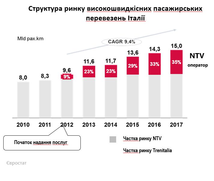 Досвід Італії показує, що вихід на ринок приватних операторів призвів до зростання ринку пасажирських перевезень на 35%.