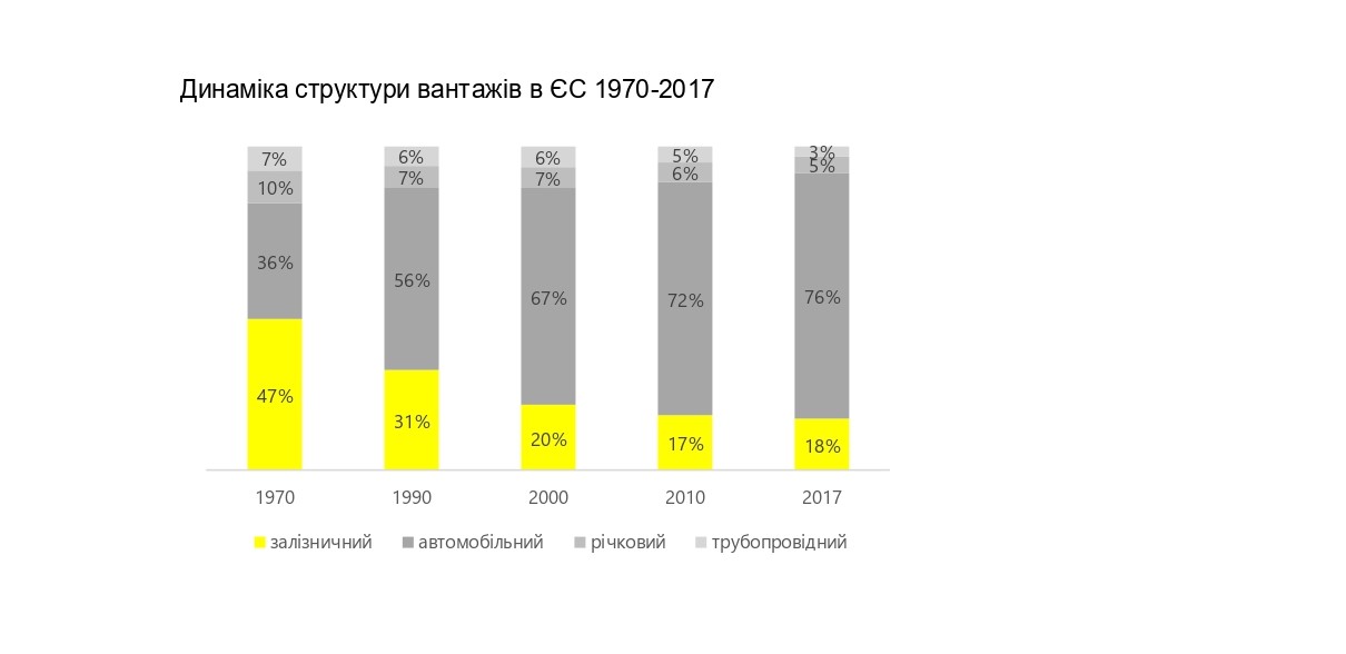 Починаючи з початку 90-х рр., частка залізничного на ринку перевезень впала більш ніж удвічі. Щоб змінити ситуацію європейські країни почали реформи. [1]