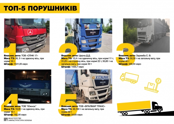 Відтак, у ТОП-5 найбільших порушників габаритно-вагових норм за минулу добу увійшли: