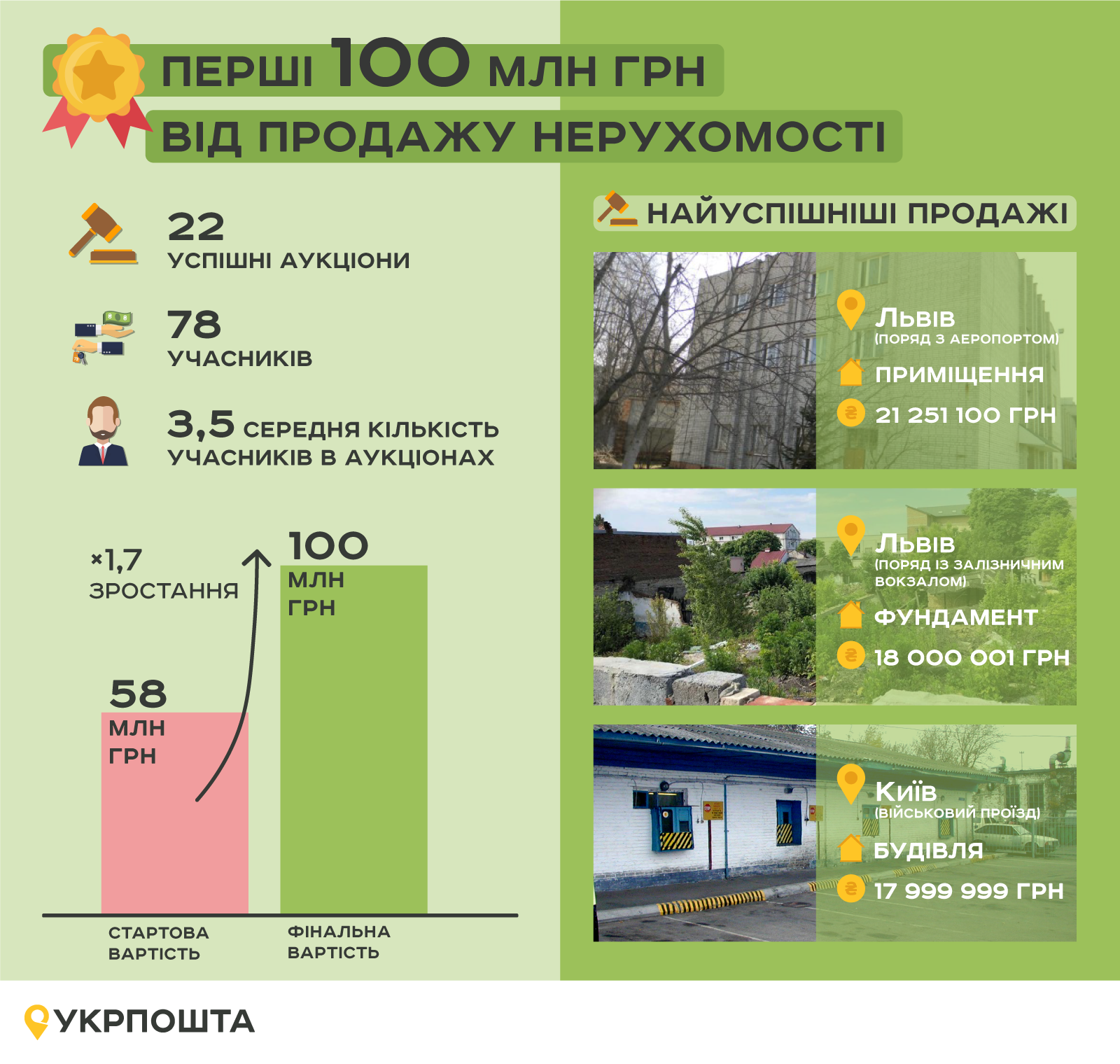 На рахунки Укрпошти надійшли перші 100 мільйонів гривень за продаж нерухомості, що не використовується у господарській діяльності. Проведено 22 успішні аукціони, в яких змагалися 78 учасників. Вартість продажу лотів Укрпошти зросла в 1,7 рази – стартова вартість проданих об’єктів становила 58 млн грн, а фінальна 100 млн грн. Аукціони були конкурентними – в середньому 3,5 учасники на кожен із лотів. Найбільше покупців зацікавив продаж будівлі на Військовому проїзді в Києві: в цьому аукціоні зареєструвалося 12 учасників, а початкова ціна лоту зросла утричі. “У квітні ми розпочали процедуру продажів непрофільних активів підприємствами галузі. Укрпошта першою долучилась до цього процесу, 100 млн гривень, які надійшли від реалізації непрофільних активів на рахунки компанії, будуть спрямовані на модернізацію Укрпошти. Те, що вартість проданих лотів в 1,7 рази перевищує стартову вартість свідчить про прозорість та конкуренцію під час аукціонів.”, - зазначив Владислав Криклій.