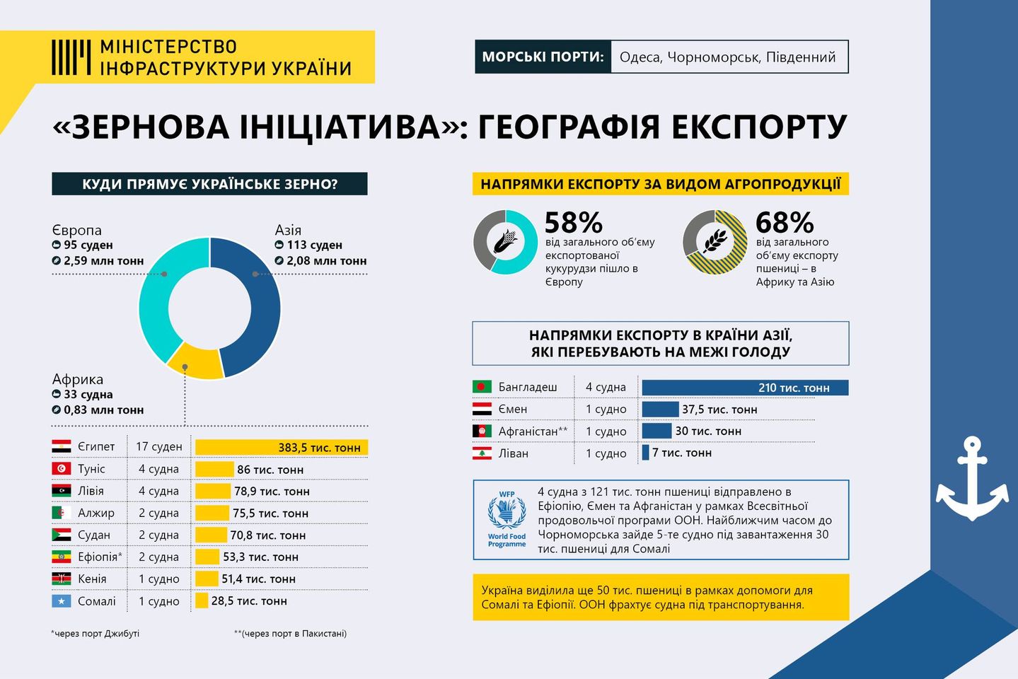 Зокрема, 30 вересня з портів Великої Одеси відправились 3 судна з понад 45 тис. тонн агропродукції на борту. Продовольство призначено для споживачів в Африці, Європі та Азії.