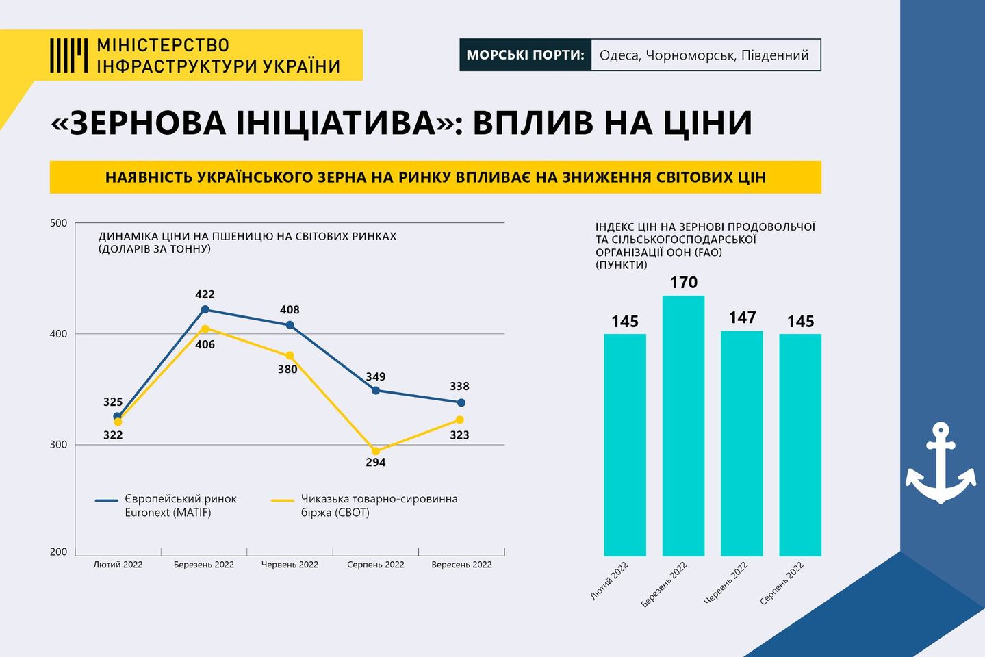 Наявність українського зерна на світових ринках позитивно впливає на рівень цін. Так вартість пшениці на європейських та американських ринках суттєво впала. Продовольство стає доступнішим для тих, хто знаходиться за крок від гуманітарної катастрофи.