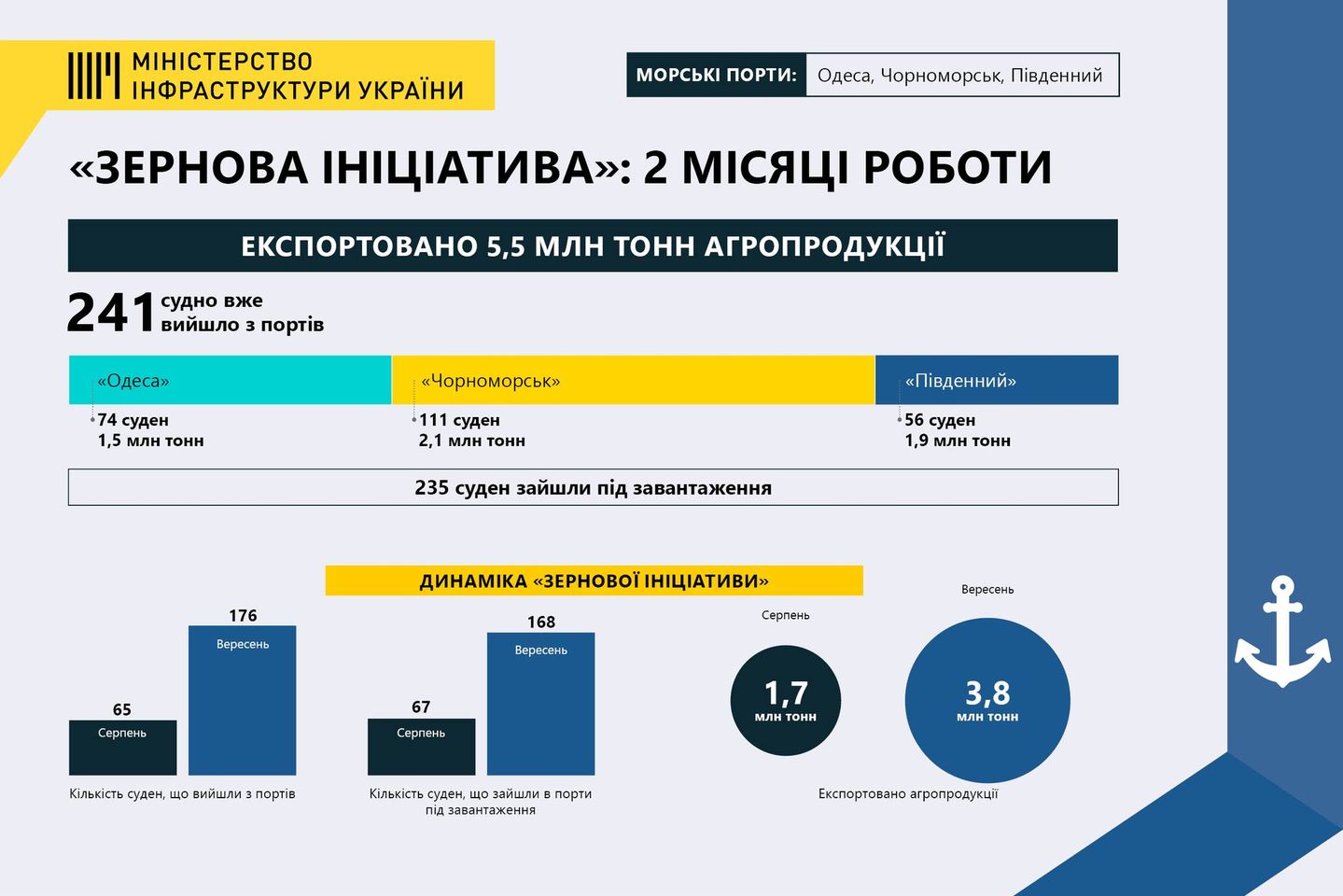 «Зернова ініціатива» успішно працює. У вересні, в порівнянні з серпнем, кількість експортованої продукції зросла у понад 2 рази, а кількість суден, які вийшли з портів — майже в 3 рази. Такі показники свідчать про довіру світу до «зернового коридору» і готовність світових інституцій, бізнесу брати участь у купівлі та транспортуванні української агропродукції.