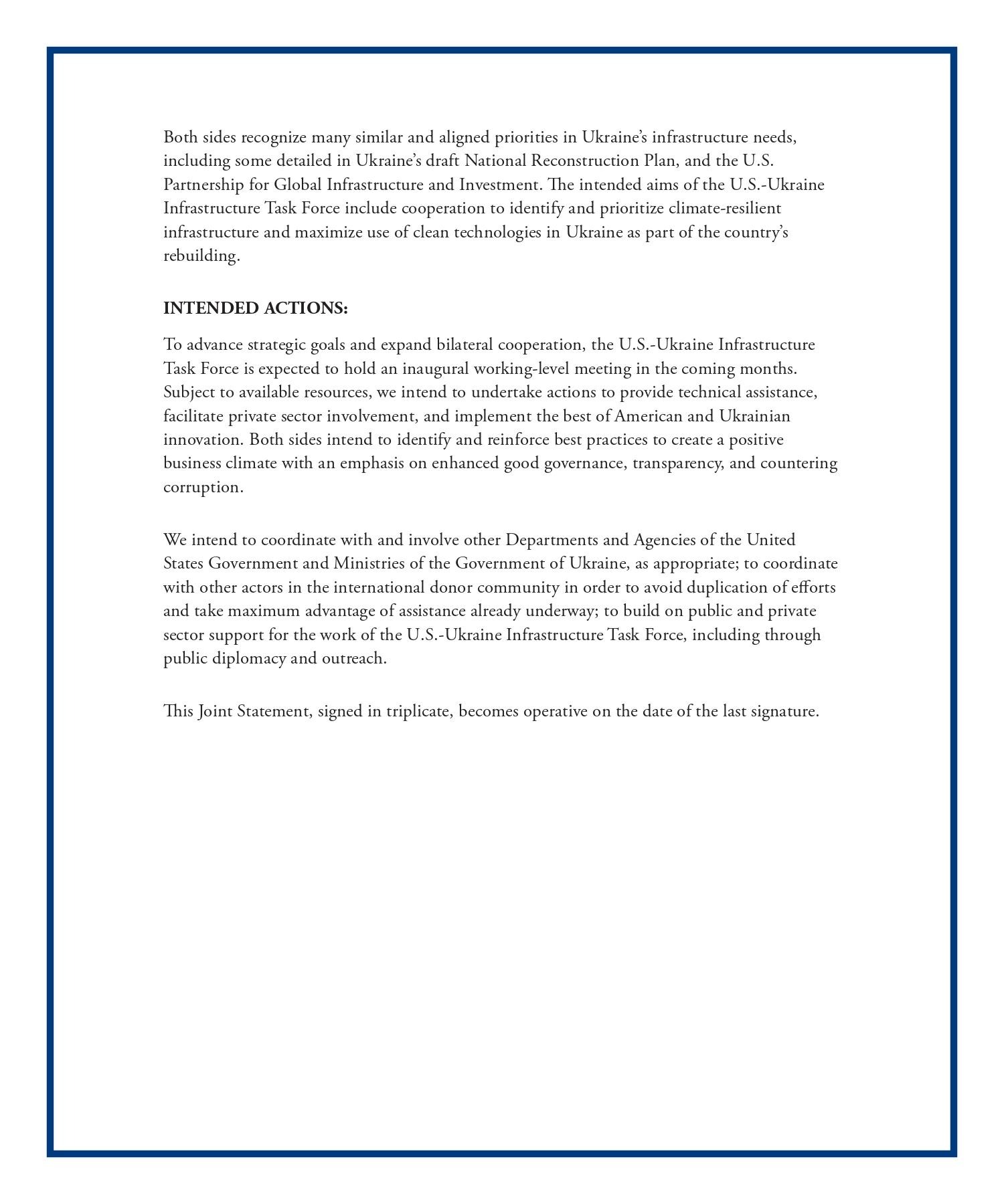 Заява передбачає створення Спільної робочої групи (Task Force), яка займеться питанням залучення американських державних інституцій, бізнесу та експертів до процесу відновлення інфраструктури України.