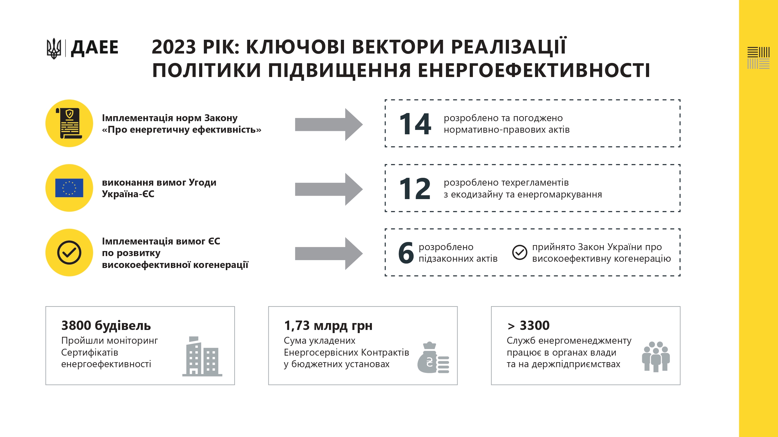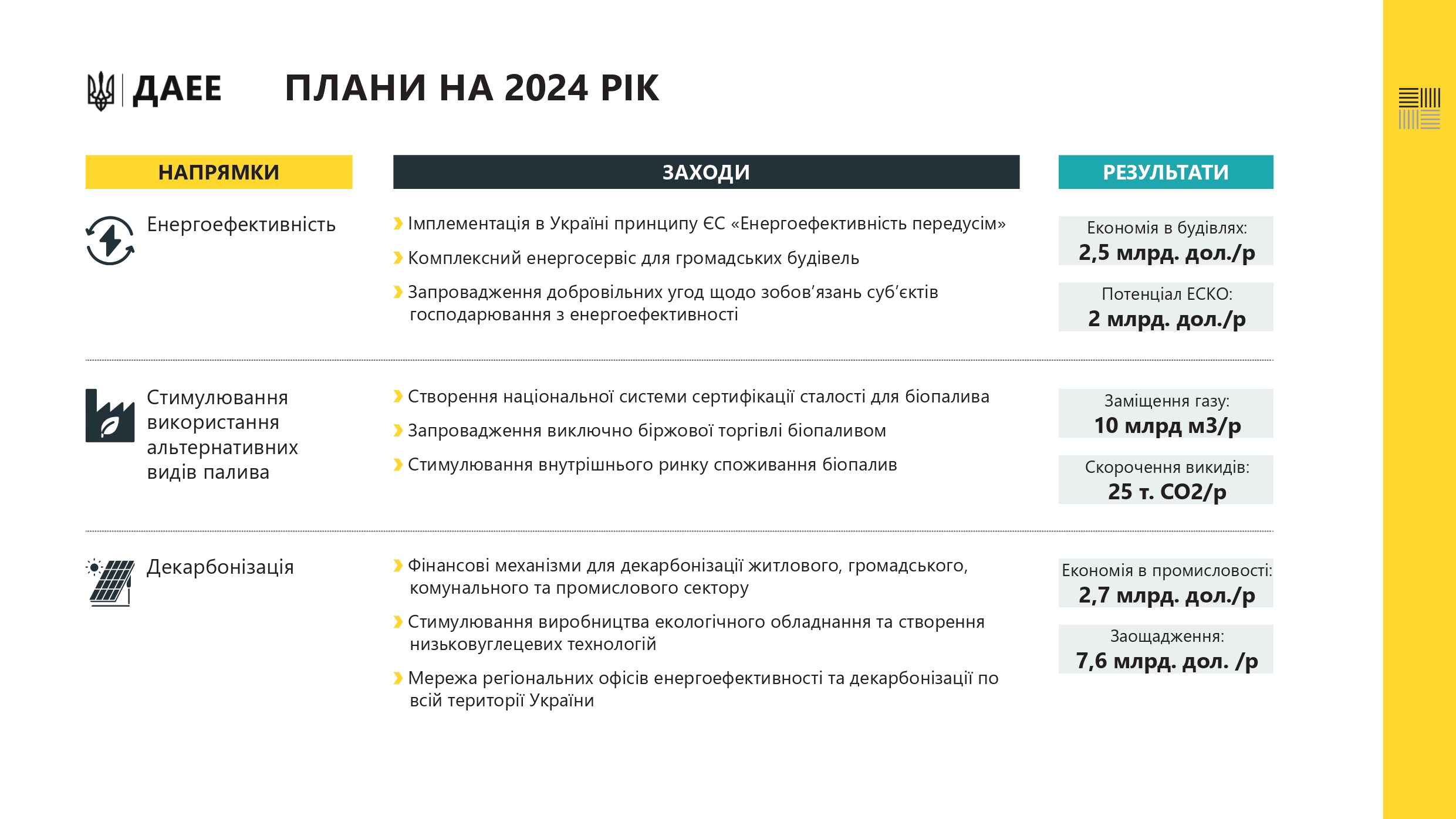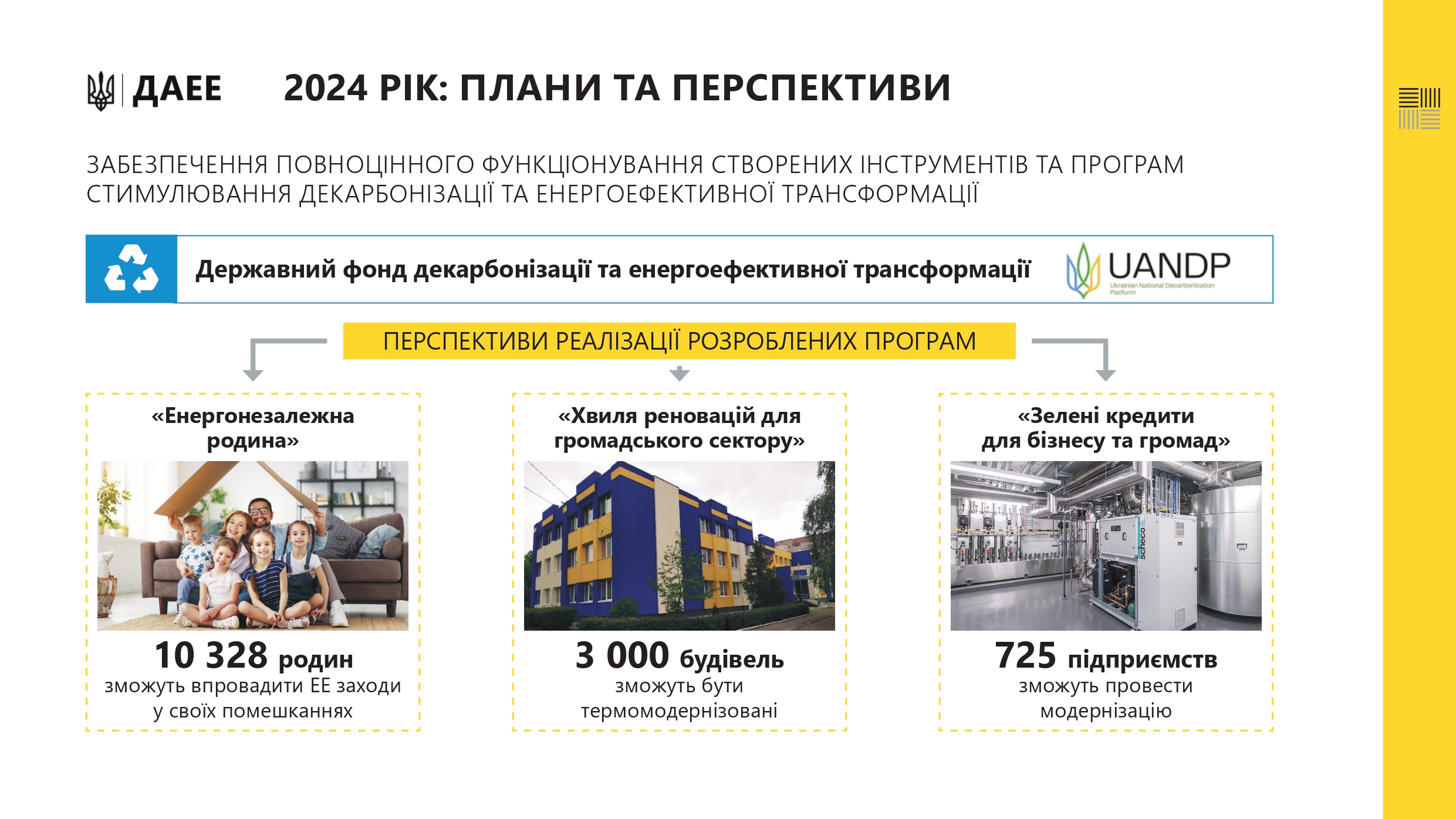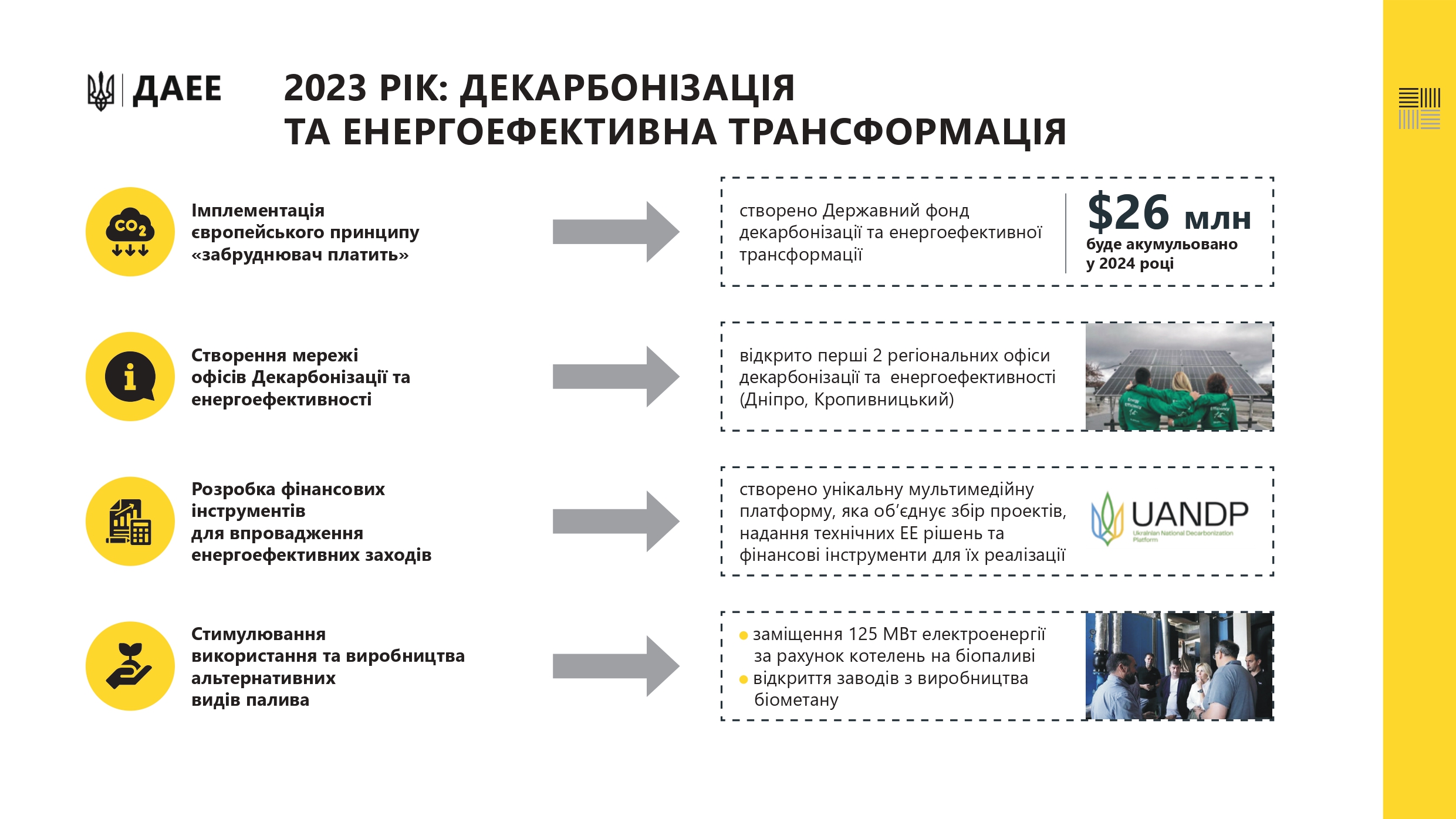 Держенергоефективності також виступило за створення Фонду декарбонізації та енергоефективної трансформації. Цьогоріч відкрито перші 2 регіональних офіси декарбонізації та енергоефективності (Дніпро, Кропивницький) для співпраці з органами місцевого самоврядування, створено унікальну мультимедійну платформу з декарбонізації UANDP, яка об’єднає збір проєктів, надання технічних енергоефективних рішень та фінансові інструменти для їх реалізації.