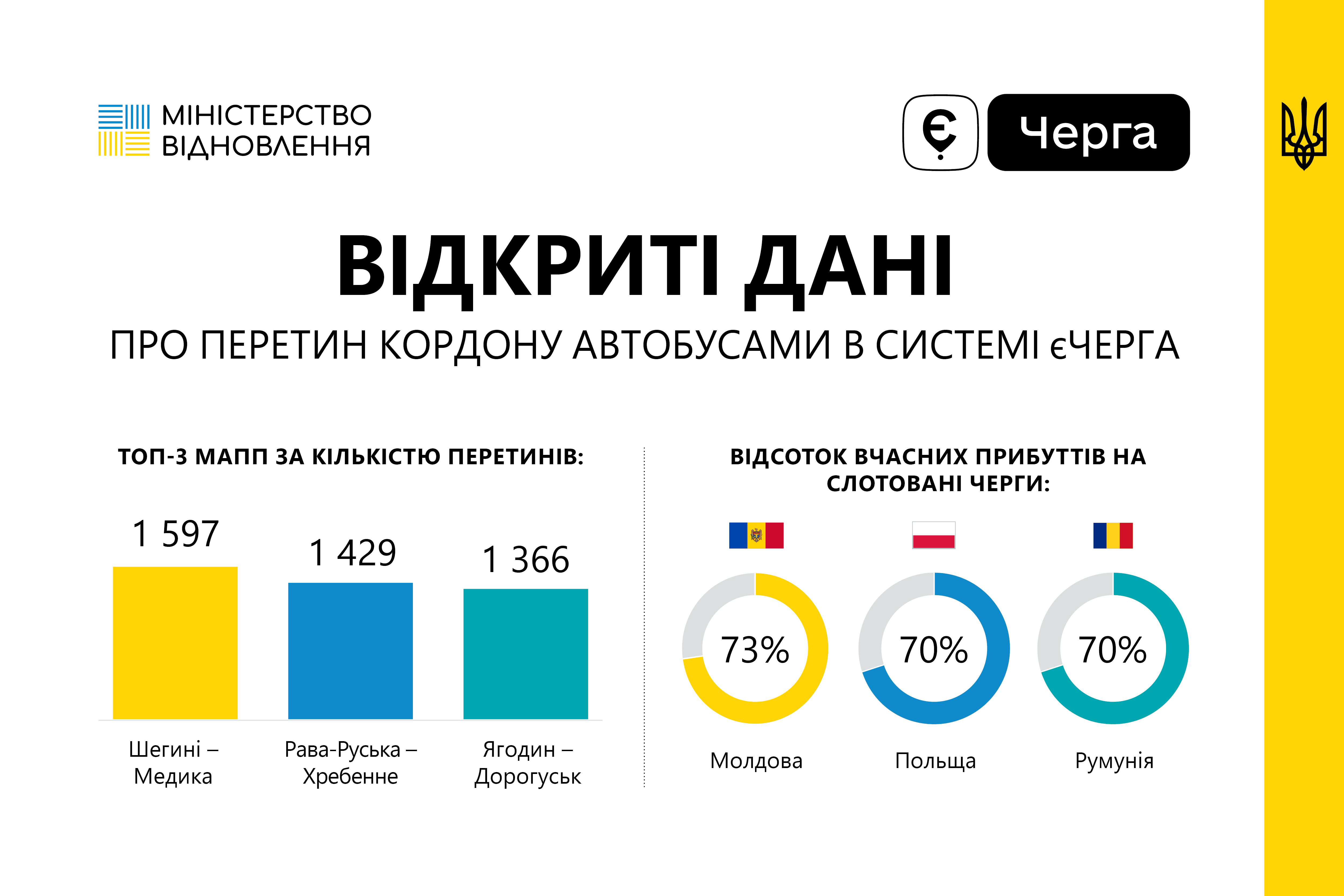 За ініціативи Міністерства розвитку громад та територій на Єдиному державному порталі відкритих даних data.gov.ua опубліковані дані про міжнародні пасажирські перевезення. Оприлюднено статистику перетинів кордону за серпень на кожному пункті пропуску, де функціонує єЧерга для автобусів. За цей період було зафіксовано майже 16 тисяч перетинів кордону пасажирськими перевізниками.