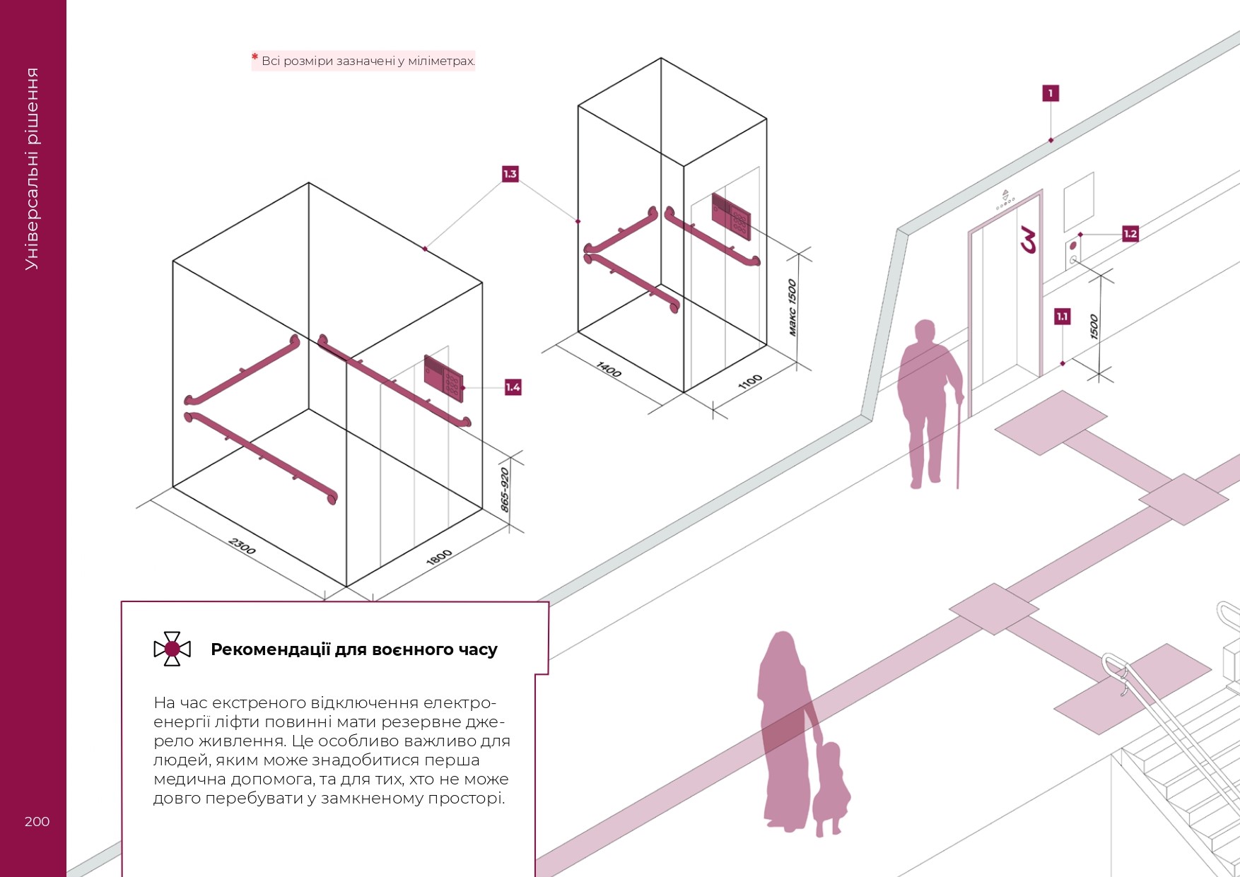 Кабіна ліфта повинна мати внутрішні розміри не менше ніж 1,1 м ширини та 1,4 м глибини. Ширина дверей ліфта в просвіті не менше ніж 0,9 м.