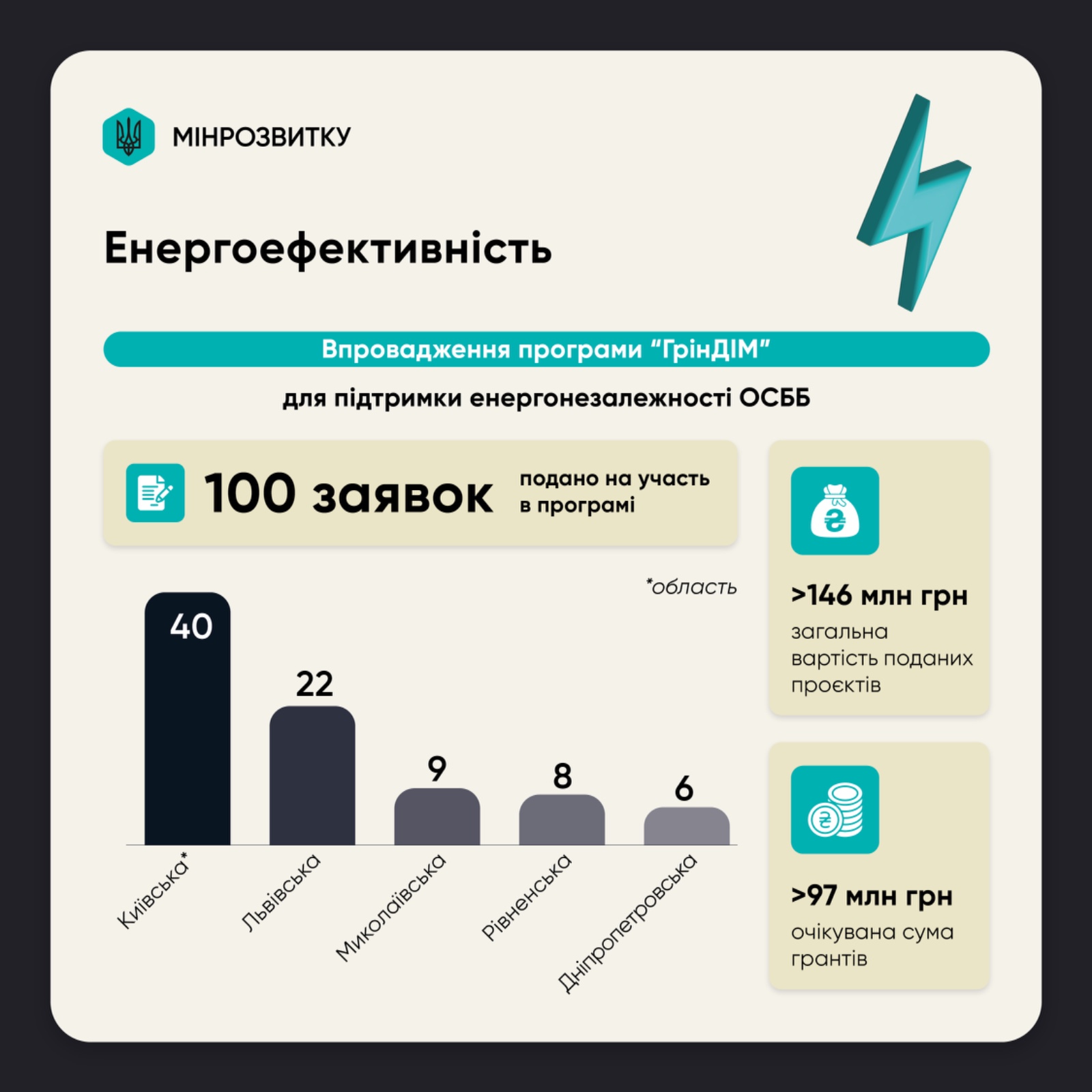 Для підтримки енергонезалежності ОСББ було подано 100 заявок на участь у програмі “ГрінДІМ”, загальна вартість поданих проєктів складає 146 млн грн, а очікувана сума грантів – 97 млн грн.