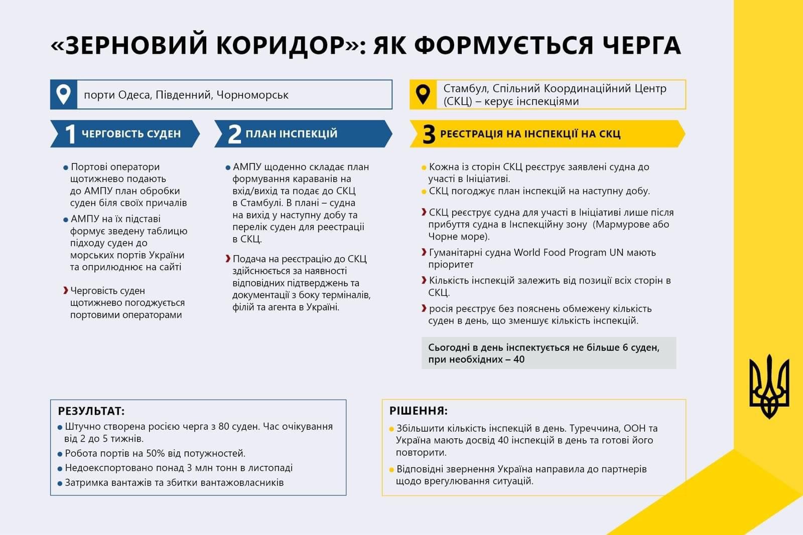 Удосконалення роботи електронної черги, запровадження онлайн чатів, регулярні наради з портовими операторами та бізнес спільнотою, онлайн моніторинг проходження судном інспекції, щоденне оновлення інформації на сайті АМПУ — всі ці заходи оптимізують та роблять процес прозорим для всіх учасників ринку. Вже зараз спостерігаємо скорочення черги від 150 суден до 90 на вхід та вихід. Звісно цей показник «скорочення черги» є результатом синергії бізнесу та держави, але це не може задовольнити потребу портів та терміналів, яка складає близько 40 суден на добу. Головною проблемою утворення черги з суден залишається деструктивна позиція рф у проходженні інспекцій у Спільному координаційному центрі. Російська сторона продовжує планомірно та безпідставно гальмувати інспекцію суден та їх реєстрацію на участь у «Зерновій ініціативі». Щодня відбувається в середньому 5-6 інспекцій з 10 запланованих. Так в березні було затверджено всіма сторонами СКЦ здійснити 303 інспекціі, але відбулось лише 168. Все це призводить до тижневого, або навіть місячного простою суден в територіальних водах Туреччини.