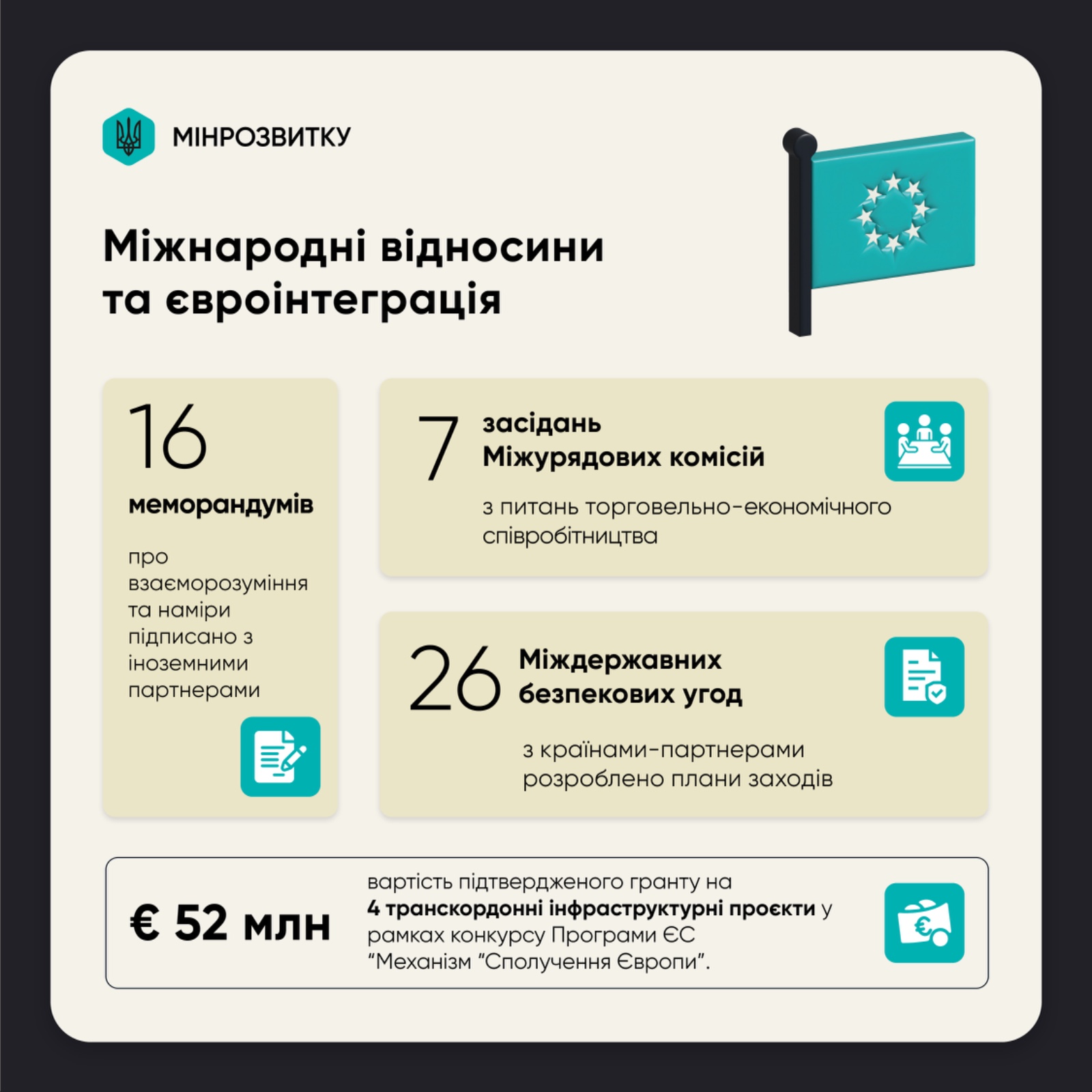 У 2024 році було підписано 16 меморандумів про взаєморозуміння та наміри з іноземними партнерами. Представники Міністерства взяли участь у 7 засіданнях Міжурядових комісій, де обговорювалися питання торговельно-економічного співробітництва. Завдяки цим зустрічам вже реалізуються домовленості за їх результатами.