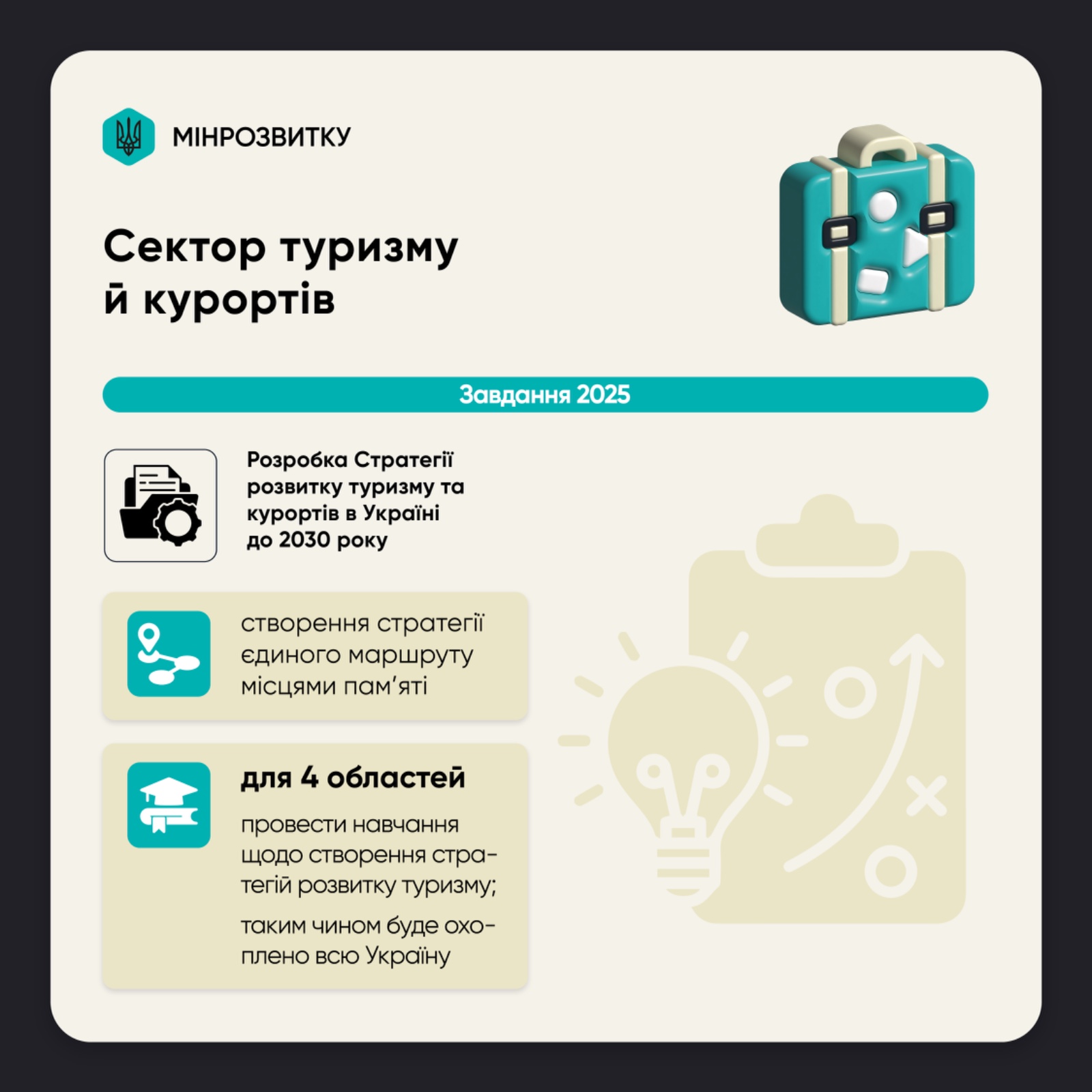 Ключові задачі у 2025 році – розробка Стратегії розвитку туризму та курортів в Україні до 2030 року. А також створення в Україні стратегії єдиного маршруту місцями пам'яті.