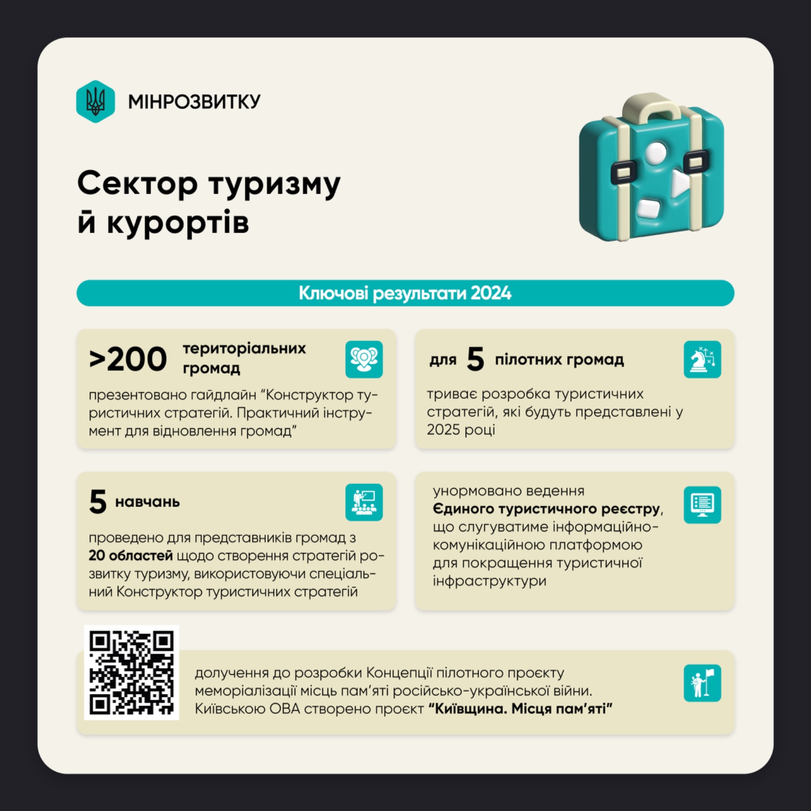 У 2024 році було створено й презентовано для більш ніж 200 територіальних громад України гайдлайн із базовими складовими стратегій у сфері туризму та ключовими показниками результативності – “Конструктор туристичних стратегій. Практичний інструмент для відновлення громад”.