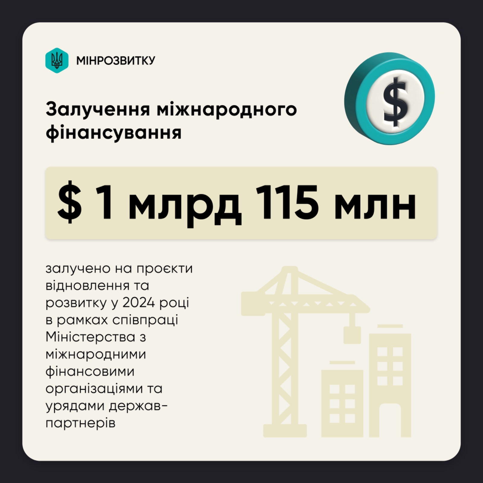 В цілому у 2024 році вдалось залучити $1 млрд 115 млн на проєкти відновлення та розвитку завдяки співпраці Мінрозвитку з міжнародними фінансовими організаціями та урядами держав-партнерів.