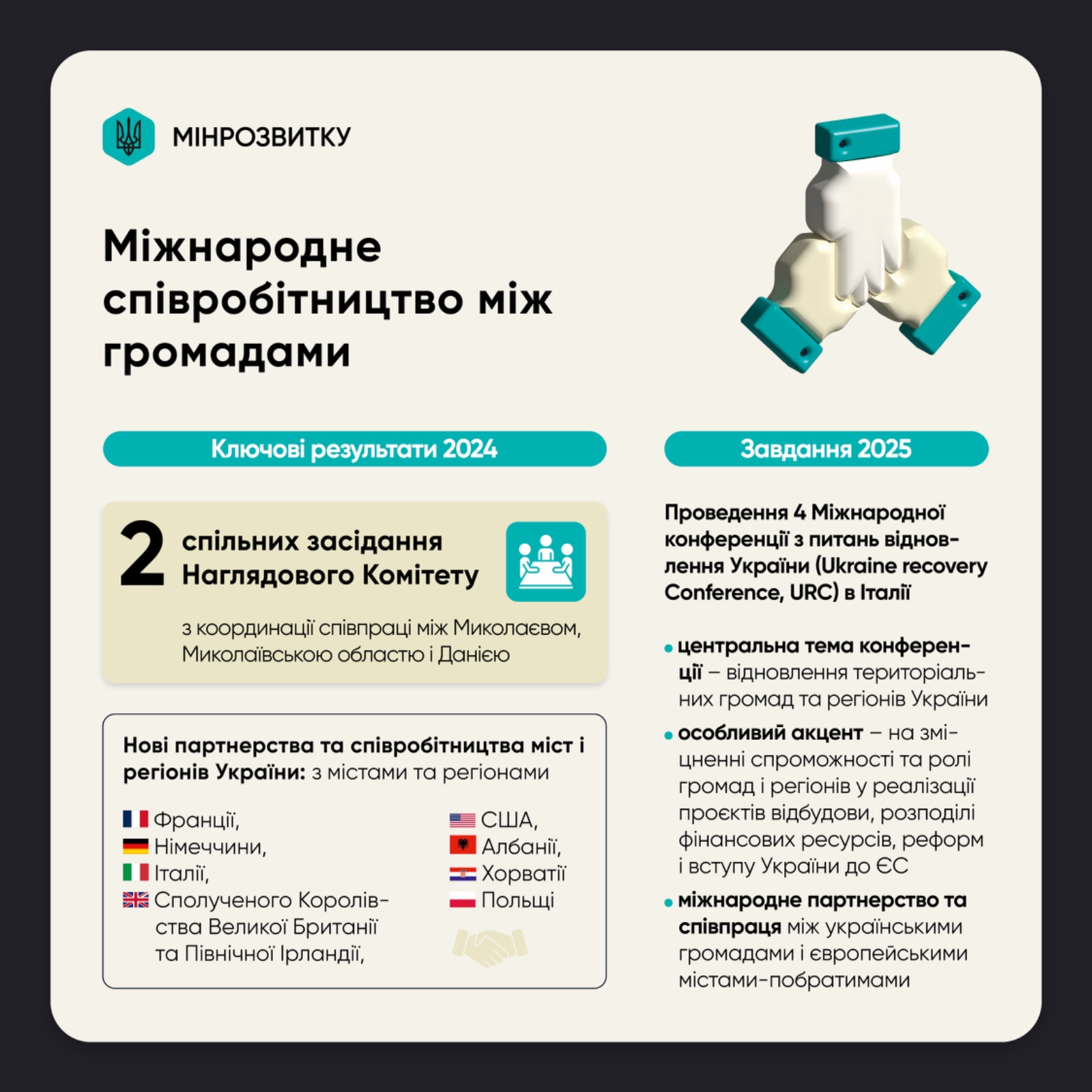 Ключове завдання у 2025 році – проведення 4 Міжнародної конференції з питань відновлення України (Ukraine Recovery Conference, URC), яка відбудеться в липні 2025 року в Римі.