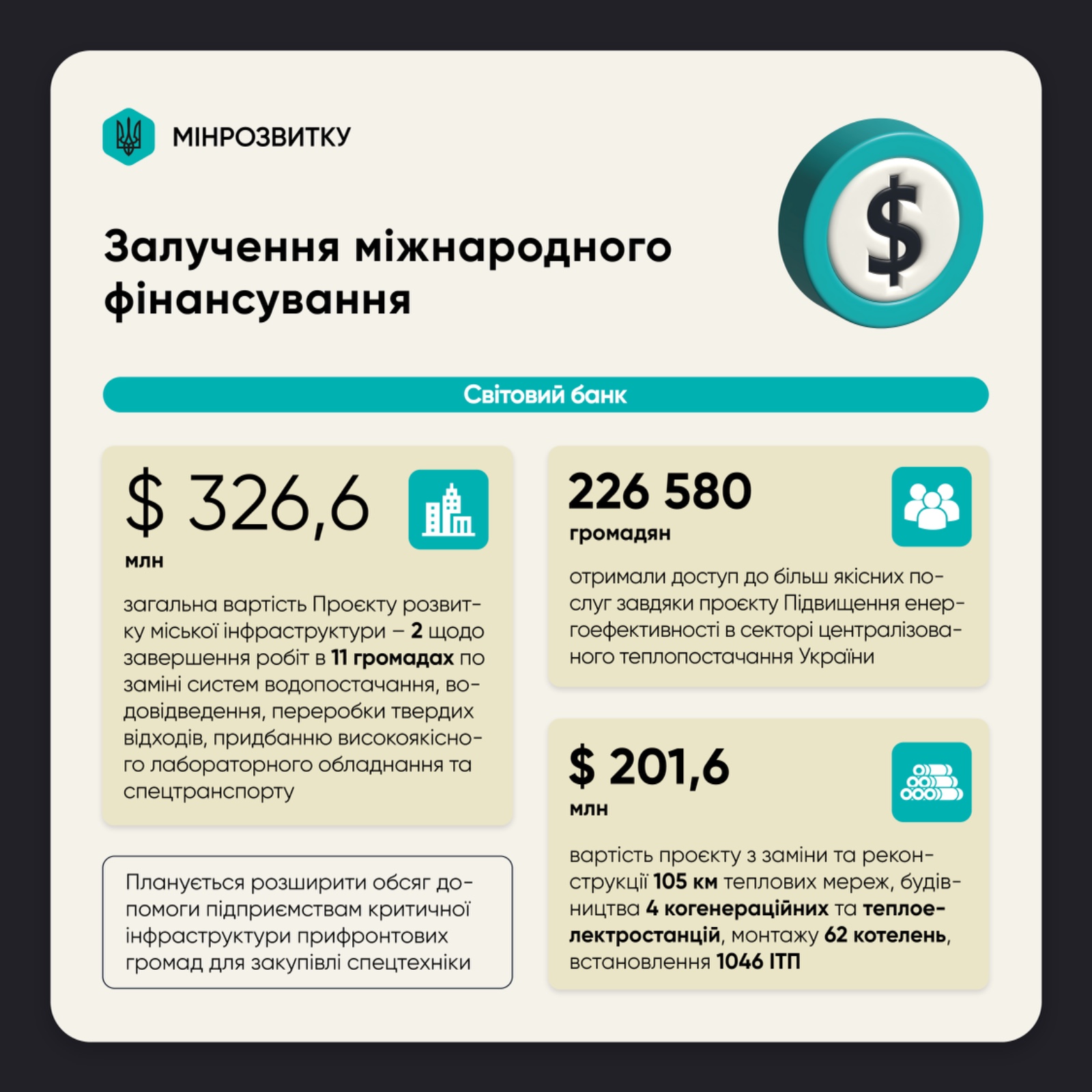 За підтримки Світового банку у 2024 році було продовжено дію Проєкту розвитку міської інфраструктури – 2. Це дозволить завершити роботи в 11 громадах по заміні систем водопостачання, водовідведення, переробки твердих відходів, придбанню високоякісного лабораторного обладнання та спецтранспорту на загальну суму у 326,6 млн дол.