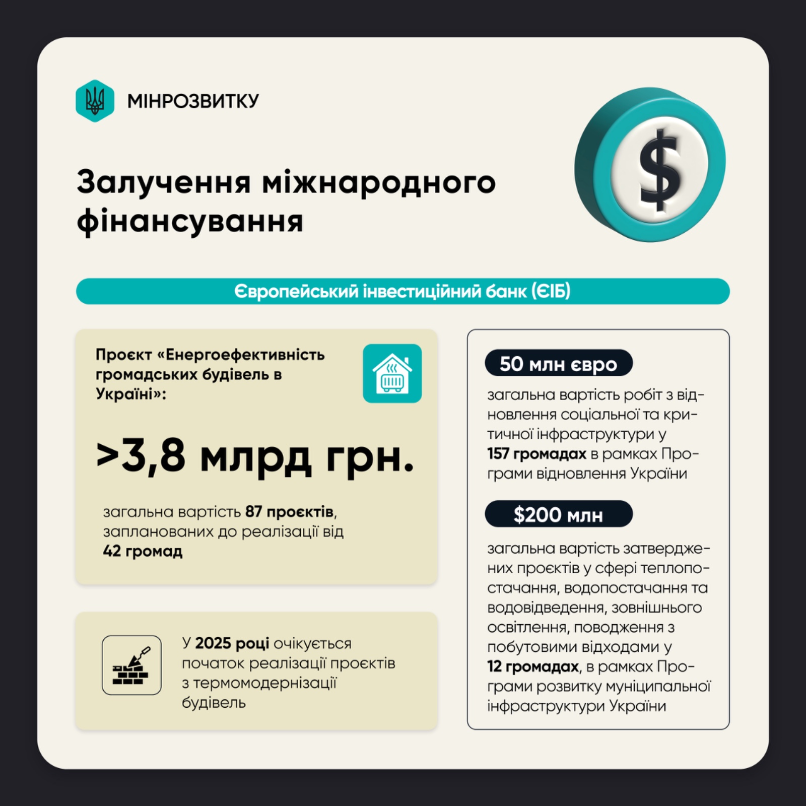 Проєкт “Енергоефективність громадських будівель в Україні” за підтримки Європейського інвестиційного банку (ЄІБ) передбачає пільгове кредитування громад для реалізації проєктів з енергоефективності в будівлях соціального сектору: школи, лікарні, садки. Наразі опрацьовано 87 проєктів, запланованих до реалізації від 42 громад України, на загальну суму понад 3,8 млрд грн.